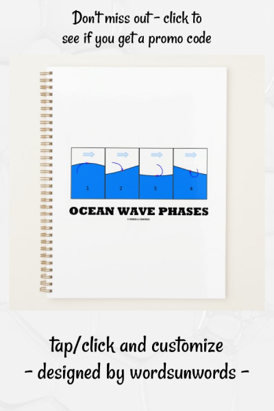 Do you spend a lot of time in the ocean or watching ocean waves? Make others do a double-take with a dose of fluid dynamics attitude with this educational scientific planner featuring "Ocean Wave Phases". The phases are as follows: 1) wave crest where the water masses of the surface layer are moving horizontally in the same direction as the propagating wave front; 2) falling wave; 3) trough where the water masses of the surface layer are moving horizontally in the opposite direction of the wave front direction; and 4) rising wave. No need to be a physicist or physics teacher to enjoy! myPhysics