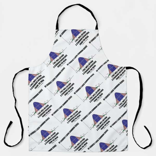 Do you lack common sense? If so, you'll enjoy this all-over print apron featuring the bell curve distribution (also known as the normal distribution curve, Gaussian curve) and the wry statistical attitude saying "Of Course I Lack Common Sense I Fall Well Beyond 3 Standard Deviations From The Mean". Make others do a double-take at your statistical side and guess exactly what you mean with this apron! myStatistician