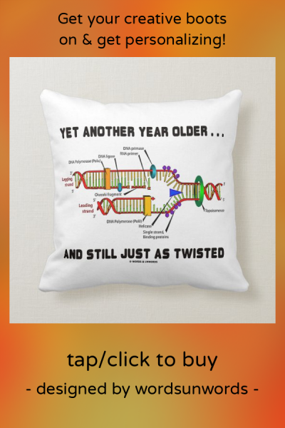 Showcase your wry molecular biology attitude toward aging with this throw pillow featuring DNA replication along with the saying "Yet Another Year Older ... And Still Just As Twisted". Makes a memorable scientific saying throw pillow for any molecular biologist or scientist! myMolecularBiology