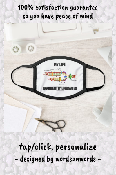 Celebrate your wry molecular biology side with this cotton/polyester face mask featuring DNA replication along with the saying "My Life Frequently Unravels". Memorable molecular biology humor face mask for anyone who knows about the leading and lagging strands of life. Geek humor cotton/polyester face mask for anyone who leads an unraveled life! myMolecularBiology