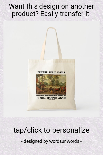 Do you think that there's "tulip mania" in the stock market today? Showcase your wry economic bubble sense of humor with this tote bag featuring Jan Brueghel the Younger's "Satire On Tulipmania" circa 1640. The infamous painting depicts monkeys in 17th century Dutch clothes and represents a satirical commentary on brainless speculators during the time of the economic bubble which focused on rare tulip bulbs. From the left one monkey points to flowering tulips with another holds up a tulip and a moneybag. Monkeys are depicted in partaking in a lavish business dinner. The monkey at left with a sword to indicate upper class status has a list of rare tulips; one monkey in the back sits astride in a horse. One monkey in the mid-foreground draws up a bill of sale. The monkeys at the right depict the denouement of the mania with one monkey urinating on the now worthless tulips while fellow speculators in debt are brought before the magistrate or weeping on the dock. In the background of the painting a speculator is carried to a grave. Brueghel's masterful depiction of Tulipmania lies in ridiculing tulip speculators as brainless monkeys with tulip speculation as part of a transitory existence from start to finish. Included in this design are the following words of wisdom for modern day speculators and investors: "Beware Tulip Mania It Will Happen Again." myEconomics