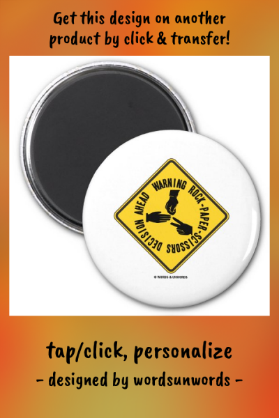 Do you frequently make decisions via the hand game of rock-paper-scissors? Showcase your wry transportation sign attitude with any of these gifts featuring the yellow diamond warning sign along with the following saying: "Warning Rock-Paper-Scissors Decision Ahead". Make everyone do a double-take on decision-making with these rock-paper-scissors warning signage gifts! myWarning