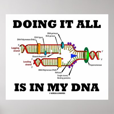 Showcase your wry molecular biology side with this poster featuring DNA replication along with the following saying for all who strive to do it all: "Doing It All Is In My DNA". Memorable geek attitude poster for anyone who manages to do it all! myWork