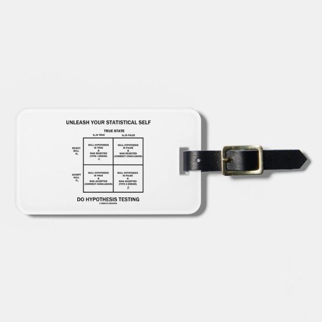 Statistician will enjoy this stats humor luggage tag featuring statistical error summarized in a chart including Type I and Type II errors along with the geek humor saying: "Unleash Your Statistical Self Do Hypothesis Testing". Memorable stats humor luggage tag for any statistician or anyone who engages in hypothesis testing! myStatistics