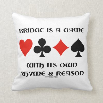Showcase your wry bridge / duplicate bridge sense of humor with this throw pillow featuring the four card suits along with the saying "Bridge Is A Game With Its Own Rhyme And Reason". Memorable bridge saying throw pillow for any avid bridge player or bridge teacher! myBridgeTeacher