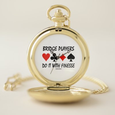 Wry bridge / duplicate bridge attitude is alive and well on this pocket watch featuring the four card suits along with the saying "Bridge Players Do It With Finesse". Do a double-take on what bridge players do with a dose of tongue-in-cheek suggestive bridge humor when you tell time with this pocket watch! myBridgePlayer