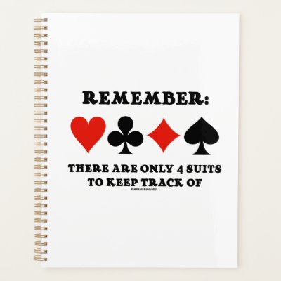 If you enjoy playing or teaching the game of bridge you'll love this timeless bridge saying planner that comes with all four card suits along with the truism bridge advice: "Remember: There Are Only 4 Suits To Keep Track Of". Memorable bridge saying planner for any bridge player who has played with a forgetful bridge partner! myBridgePlayer