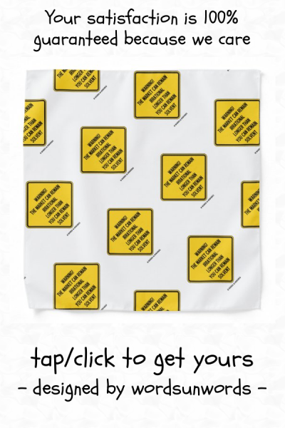 Have you ever tried to short a stock? Showcase your wry economics / investing sense of humor with this yellow diamond warning sign bandana featuring the following truism saying about why you should not short stock: "Warning! The Market Can Remain Irrational Longer Than You Can Remain Solvent". Make others do a double-take with a dose of investing signage humor today with this bandana! myWarning