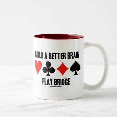 If you're an avid bridge player you'll enjoy wry bridge / duplicate bridge humor with this mug featuring the four card suits along with the saying "Build A Better Brain Play Bridge". Make others do a double-take at what the game of bridge does to one's brain with a dose of brainy humor today! myBridgePlayer
