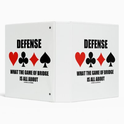 Communication with your bridge partner on defense is truly what the game of bridge / duplicate bridge is all about. Showcase your wry bridge / duplicate bridge sense of humor with this binder featuring the four card suits along with the saying "Defense What The Game Of Bridge Is All About". If you love defending a bridge hand you'll enjoy this bridge attitude binder! myBridgePlayer