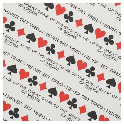 Bridge attitude is alive and well on this fabric featuring the four card suits along with the saying "I Never Get Tired Of The Great Game Of Bridge". Make others do a double-take with a dose of indefatigable attitude toward the great game of bridge the next time you create with this memorable bridge saying fabric! myBridgePlayer