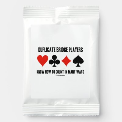 If you play duplicate bridge then you surely must know how to count your cards in several different ways everything from your winners losers and what cards your bridge partner may hold. Showcase your wry duplicate bridge attitude with this drink mix featuring the four card suits (spade heart club diamond) along with the bridge truism saying "Duplicate Bridge Players Know How To Count In Many Ways"! Memorable drink mix for any die-hard duplicate bridge player! myBridgePlayer