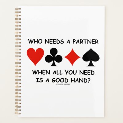 Wry bridge attitude comes alive on this planner featuring the four card suits and asks the following question: "Who Needs A Partner When All You Need Is A Good Hand?" Planner for any bridge player who wishes that one did not need a partner to play bridge and who understands that sometimes at the bridge table it just takes a good hand to win! myBridgePlayer