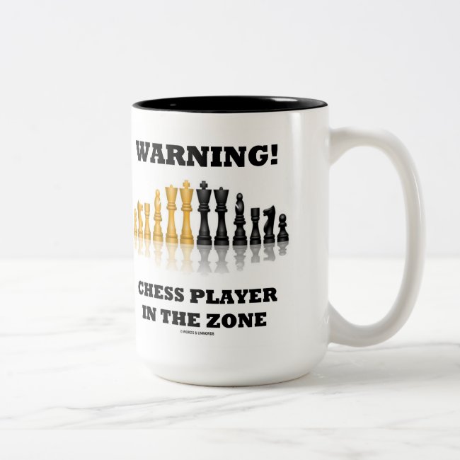 Showcase your wry chess player side with this mug featuring a reflective chess set along with the saying "Warning! Chess Player In The Zone". Memorable mug gift for any chess player who likes to go into the zone when playing chess! myChess