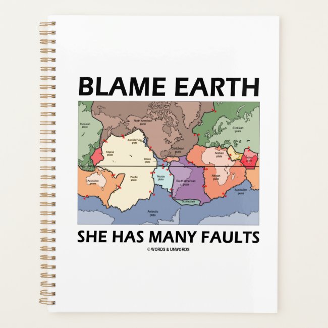 No need to be have experienced an earthquake to understand that the Earth has many fault lines. Showcase wry plate tectonics humor with this planner featuring the different plates of the Earth along with the scientific truism double-entendre saying "Blame Earth She Has Many Faults". Comes with a world map featuring the different plates of the Earth. Educational scientific saying planner for seismologists geologists earth scientists and anyone who understands that Earth has many faults! myGeology