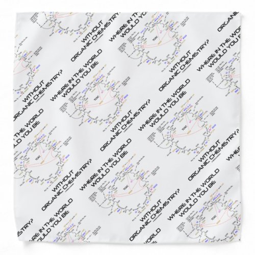 Krebs cycle attitude is found on this bandana featuring the citric acid cycle (tricarboxylic acid cycle TCAC) along with the following rhetorical question: "Where In The World Would You Be Without Organic Chemistry?" Make others do a double-take with a dose of wry biochemistry humor today - no need to be an organic chemist or biochemist to enjoy this bandana! myBiochemistry