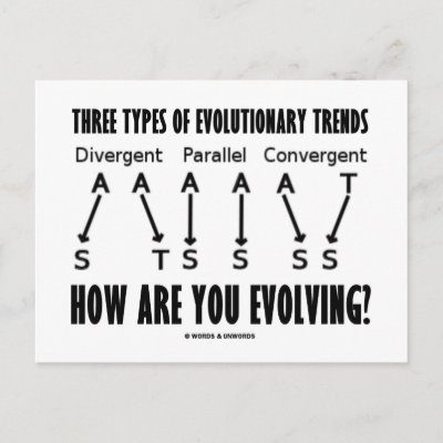 Evolutionary education humor comes alive on any of these gifts that feature the three types of evolutionary trends: divergent parallel convergent. Ask yourself and others this key question: "How Are You Evolving?" Wry scientific attitude gifts for all who evolve over time! Make others do a double-take today! myEvolution