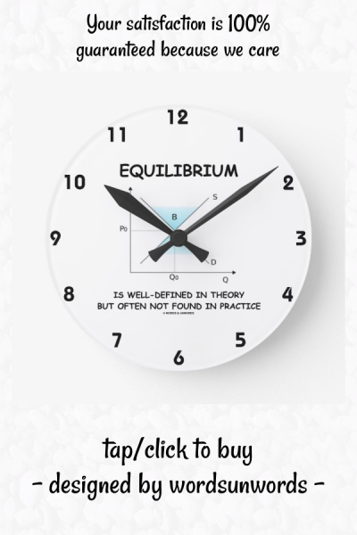 If you are frequently not in equilibrium - from an economics and psychological perspective - you'll enjoy this supply-and-demand curve clock featuring the supply-and-demand graph along with the wry economics truism saying: "Equilibrium Is Well-Defined In Theory But Not Often Found In Practice". Memorable clock for anyone who seeks economic equilibrium but often never finds it. myEconomics