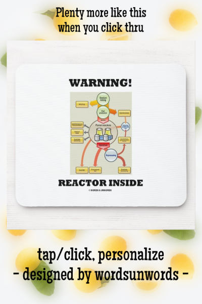 Is there a nuclear reactor inside of you? No need to be a nuclear physicist -- although it helps -- to enjoy this wry technology diagram mousepad featuring the inputs and outputs of a nuclear power reactor along with the saying "Warning! Reactor Inside". Sound advice mousepad for anyone who just keeps humming along! Memorable tongue-in-cheek mousepad for anyone who works in nuclear power industry! myWarning
