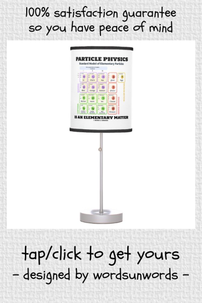 Make others do a double-take on the world of particle physics with this lamp featuring the Standard Model of Elementary Particles along with the following geek humor saying: "Particle Physics Is An Elementary Matter." Memorable lamp for any physicist or physics major who thinks in terms of leptons quarks electrons gluons neutrinos and bosons! myPhysics