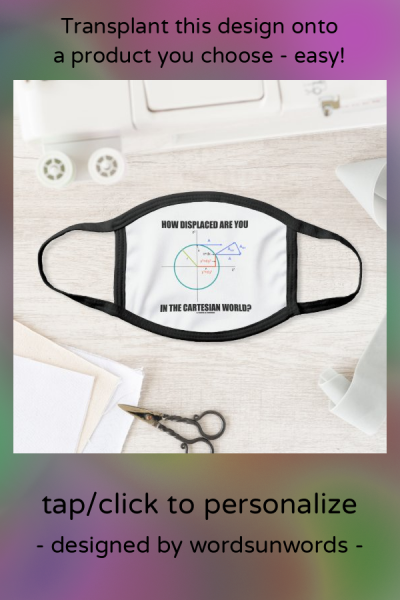 Wry mathematical graph humor comes alive on this design featuring parallel displacement along with the math truism query "How Displaced Are You In The Cartesian World?" Colorful educational geometry / trigonometry design. Perfect cotton/polyester face mask for any geek who feels displaced in the Cartesian world! myMathematician