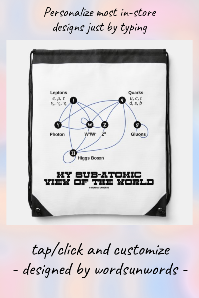 Showcase your wry Higgs Boson physics side this drawstring bag featuring the standard model of the Higgs field along with the saying "My Sub-Atomic View Of The World". Memorable educational geek attitude drawstring bag for any quantum physicist! myPhysics