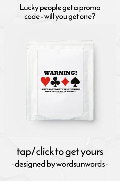 If you have a love-hate relationship with the game of bridge you'll enjoy this wry bridge / duplicate bridge saying drink mix featuring the four card suits. Comes with the truism saying that will make others do a double-take at the bridge table: "Warning! I Have A Love-Hate Relationship With The Game Of Bridge". Memorable drink mix for anyone who has had winning and losing streaks when playing duplicate bridge! myWarning