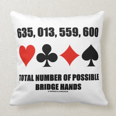 Showcase your wry bridge / duplicate bridge side with this throw pillow featuring the four card suits along with the following saying: "635 013 559 600 Total Number Of Possible Bridge Hands". Make others do a double-take at the number of possible combinations amongst 13 cards there truly are once a hand has been dealt! A bridge player will definitely not live to play them all! myBridgePlayer