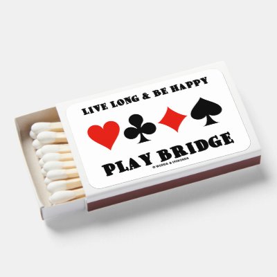 If you desire to live longer and be happy and are a bridge player you'll enjoy this bridge saying matchbox featuring the four card suits along with the saying "Live Long & Be Happy Play Bridge". Sound bridge advice matchbox for any avid bridge / duplicate bridge player - no matter what age! myBridgePlayer