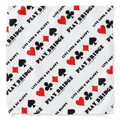 If you desire to live longer and be happy and are a bridge player you'll enjoy this bridge bandana featuring the four card suits along with the saying "Live Long & Be Happy Play Bridge". Sound bridge advice bandana for any avid bridge / duplicate bridge player - no matter what age! myBridgePlayer