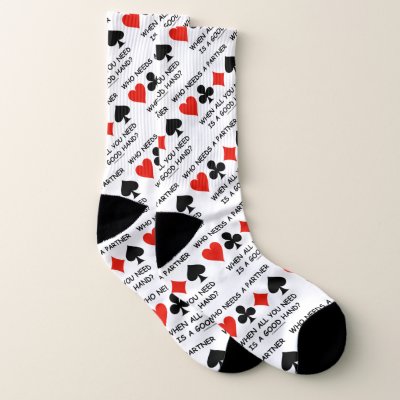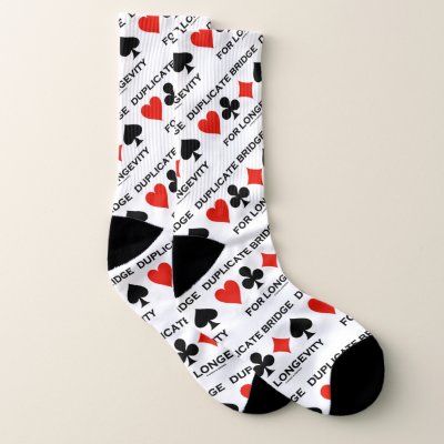No need to have Alzheimer's or dementia to enjoy wry duplicate bridge attitude with this pair of socks featuring the four card suits along with the duplicate bridge truism saying "Duplicate Bridge For Longevity". Tongue-in-cheek humor for anyone who knows about the longevity benefits that comes from playing duplicate bridge regularly! myBridgePlayer