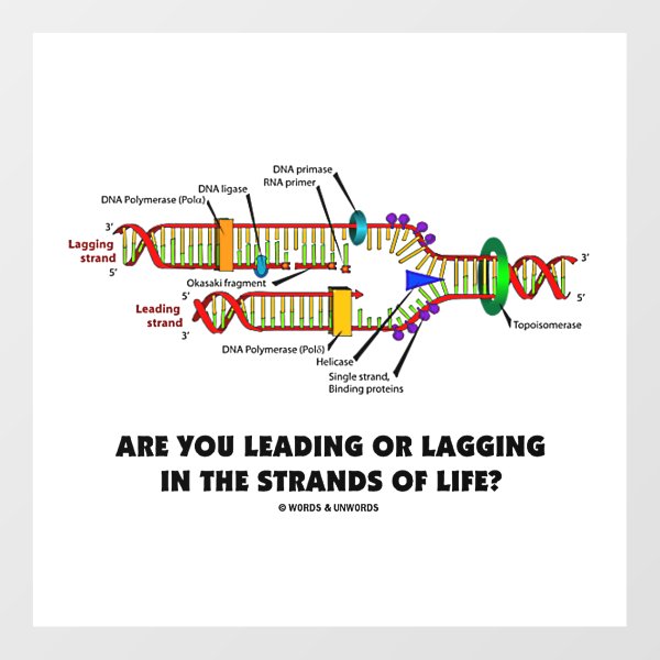 Showcase your wry existential molecular biology side with this DNA strand floor decal, complete with labeled deoxyribonucleic acid, the double helix. Ask yourself and others this key question: "Are You Leading Or Lagging In The Strands Of Life?" Perfect DNA replication geek humor floor decal for anyone who ponders about the strands of life! myMolecularBiology