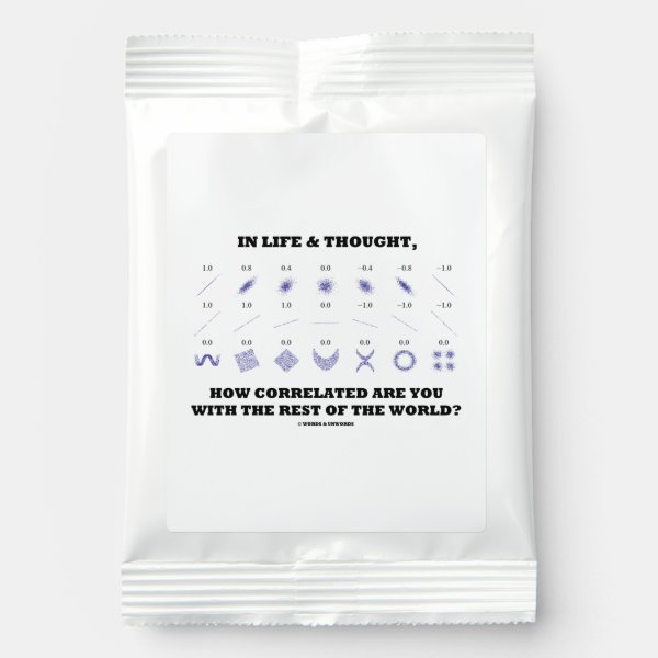 Showcase your wry statistical side with this drink mix featuring various correlations and their corresponding correlation coefficients along with the following existential stats query: "In Life & Thought How Correlated Are You With The Rest Of The World?" Do a double-take on the subject of correlation with a dose of statistical attitude today with this drink mix! myStatistician